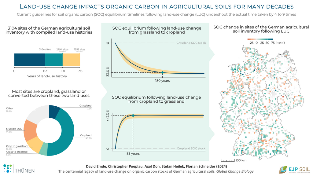 Using data and compiled historical land-use histories for the 3104 sites of the German Agricultural Soil Inventory, we investigated how converting grasslands to croplands, or vice versa, alters organic carbon in soils. We found that soils continue to experience changes to organic carbon stocks for many decades after conversion and that a new equilibrium is reached at very different rates depending on the direction of land-use change.