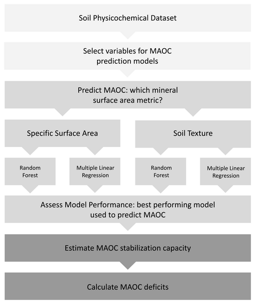 This study addresses the growing consensus that soils offer an unparalleled opportunity to sequester additional carbon from the atmosphere in efforts to mitigate anthropogenic greenhouse gas emissions by estimating the mineral-associated organic carbon (MAOC) formation capacity and deficits of soils in the Okanagan Valley, British Columbia, Canada. We found that MAOC deficits were present in all soils and increased with depth, and that the upper 30 cm of these soils have the potential to increase MAOC stocks by 29% before they reach formation capacity.