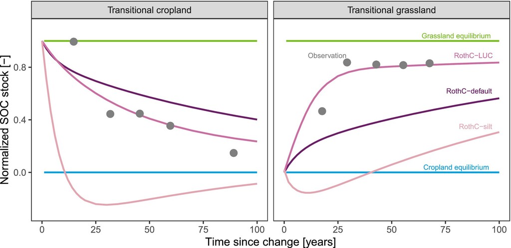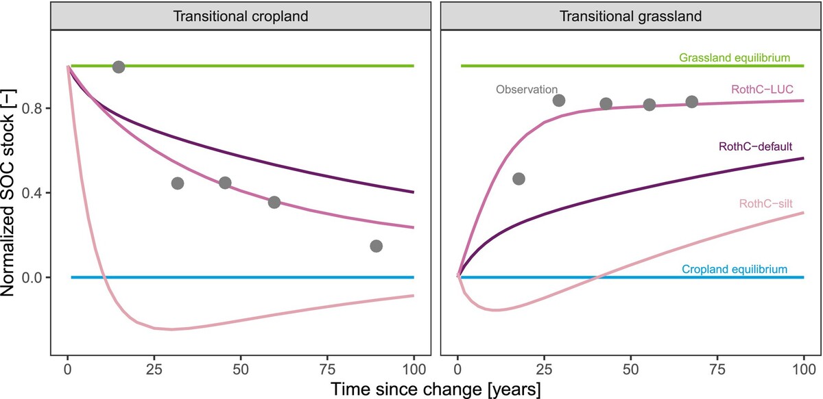 Using data and compiled historical land-use histories for the 3104 sites of the German Agricultural Soil Inventory, we investigated how converting grasslands to croplands, or vice versa, alters organic carbon in soils. We found that soils continue to experience changes to organic carbon stocks for many decades after conversion and that a new equilibrium is reached at very different rates depending on the direction of land-use change.