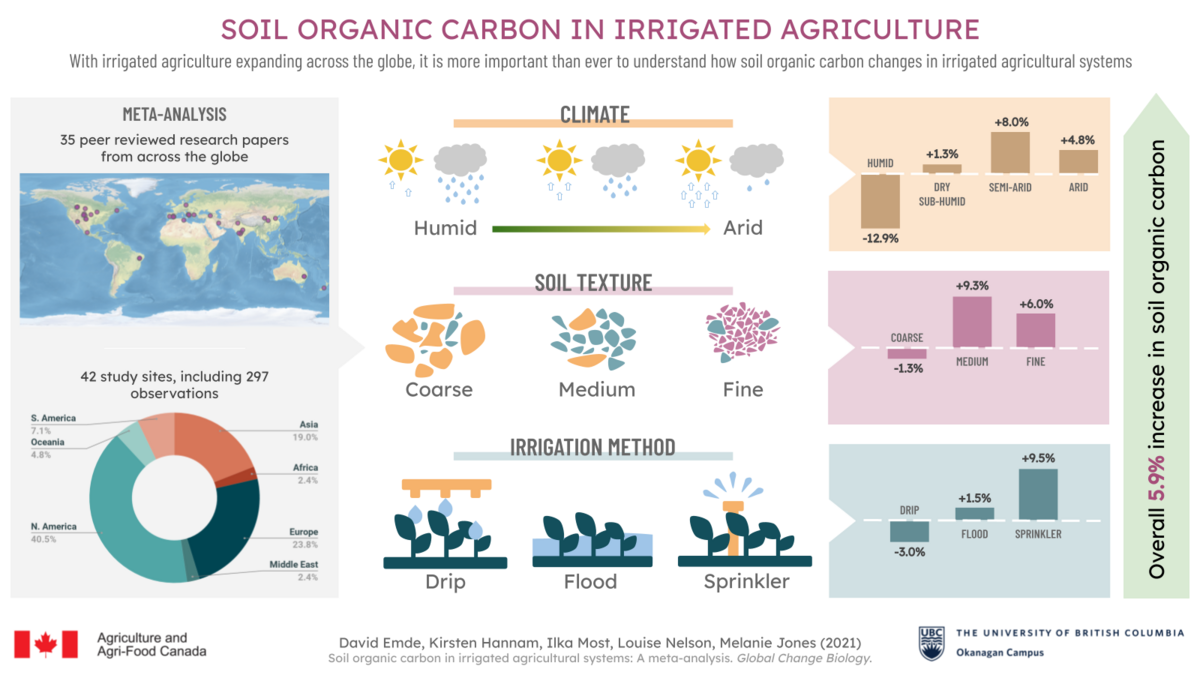 Irrigated agriculture is expanding across the globe, but the effects of irrigation on soil organic carbon (SOC) stocks are poorly understood. We conducted a meta-analysis to examine changes in SOC on irrigated agricultural sites. In contrast to many agricultural systems, which tend to lose soil carbon with time, we found that SOC increased by 5.9% on irrigated sites, overall. SOC increases were greatest in surface soils, in finer-textured soils, in drier climates and under sprinkler irrigation.