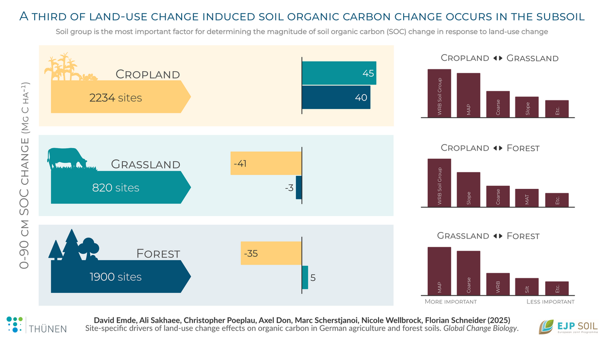 Land-use change—for example, turning cropland into forest—alters soil organic carbon (SOC) storage to different degrees depending on soil type. Data from the German national agricultural and forest soil inventories and new modeling techniques show that, while most of this SOC change occurs in the topsoil, 30% occurs below 30 cm depth. These insights can help improve agricultural carbon accounting and emissions reporting, aiding in global efforts to mitigate climate change.