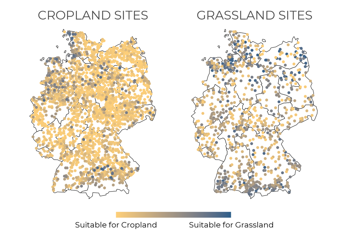 With Germany as a case study, we determined which soil, terrain, and climate properties govern current agricultural land use and historic land-use change (LUC) to inform future land-use decisions. We found that hydrological conditions (i.e., precipitation, groundwater level, and factors that affect drainage) drove land use and land-use change over the past century. The patterns outlined in this study provide novel insights into how differences in site properties affect land use and can inform future LUC priorities.