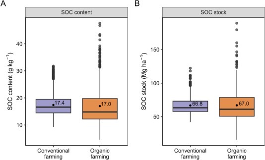 While long-term field experiments suggested organic farming could build up more soil organic carbon (SOC), a large-scale analysis of over 2,000 organic and conventional sites in Germany was conducted to test this finding in agricultural reality. The study found that organic croplands had neither higher SOC content nor higher SOC stocks compared to conventional croplands, even though organic farms used crop rotations known to enhance SOC. This is likely because the lower yields in organic farming resulted in less crop residue being returned to the soil, challenging the view that extending organic farming will increase total SOC accrual, though the SOC in organic systems is built up more sustainably.